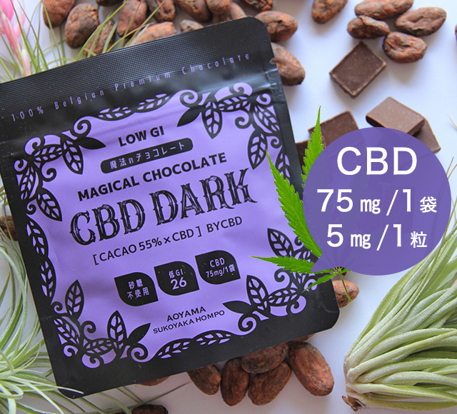 リラックス効果が期待できるCBDが入った”魔法のチョコレート CBD DARK”。有機認定農園で栽培されたカカオを100%使用した砂糖不使用・低GI・サスティナブルチョコレートに、安心・安全なナチュラル&オーガニック CBDを配合しました。